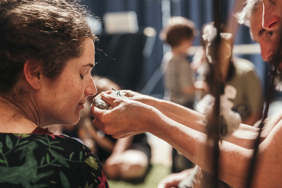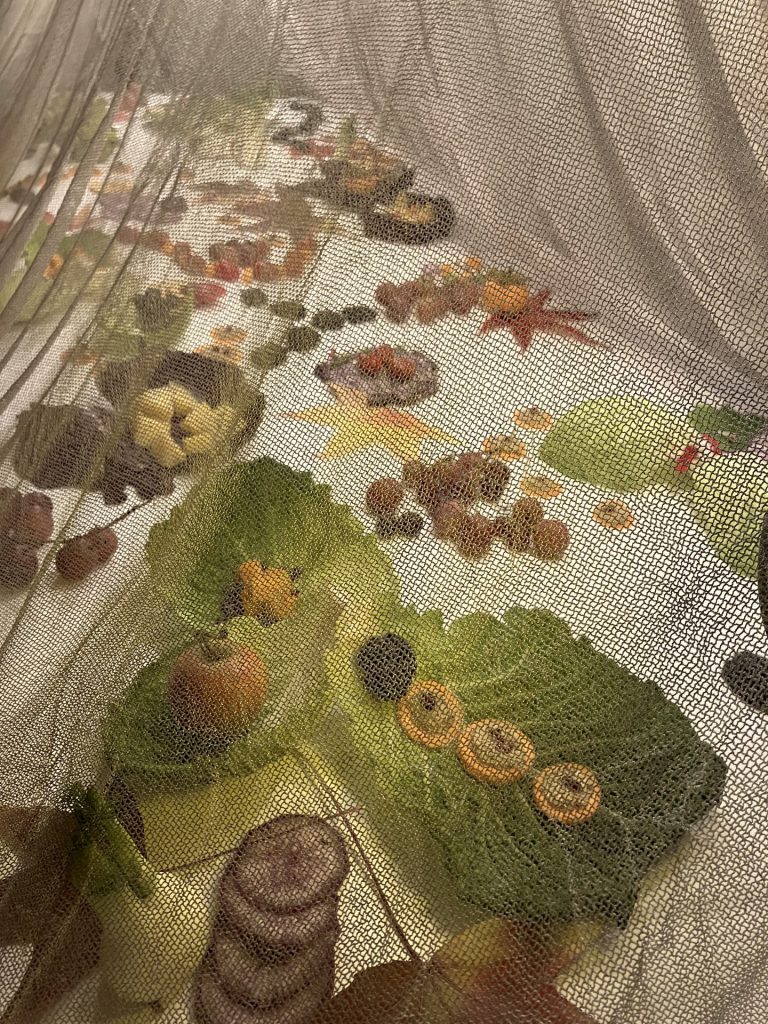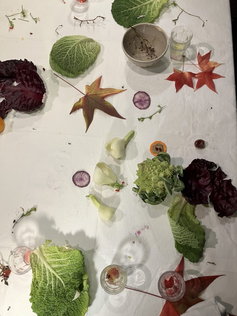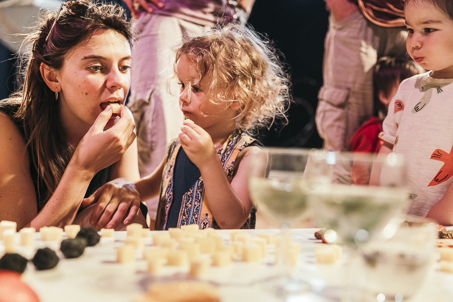 Nous nous faufilons sous la table cabane grande comme un ventre. Il est temps maintenant de nous retrouver autour du goûter paysage, rituel partagé fait de formes colorées, de parfums et de saveurs à déguster.
