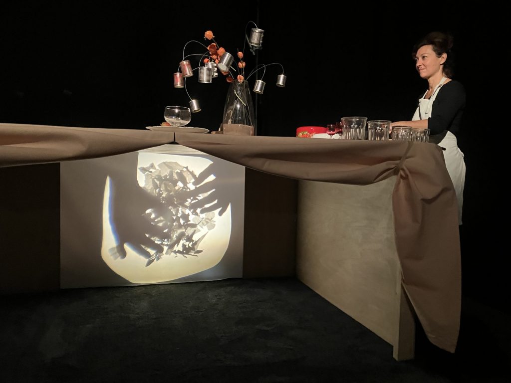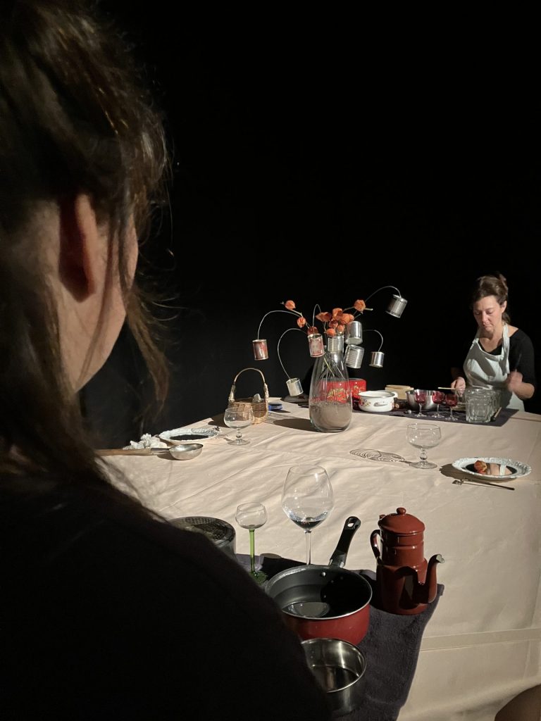 Dans un cheminement poétique et décalé nous traversons la clairière, longeons le ruisseau jusqu’au potager. Bêcher, piocher, ramasser pour amener la récolte en cuisine. Touiller, couper, mijoter, les ustensiles sonnent dans une histoire sans paroles.